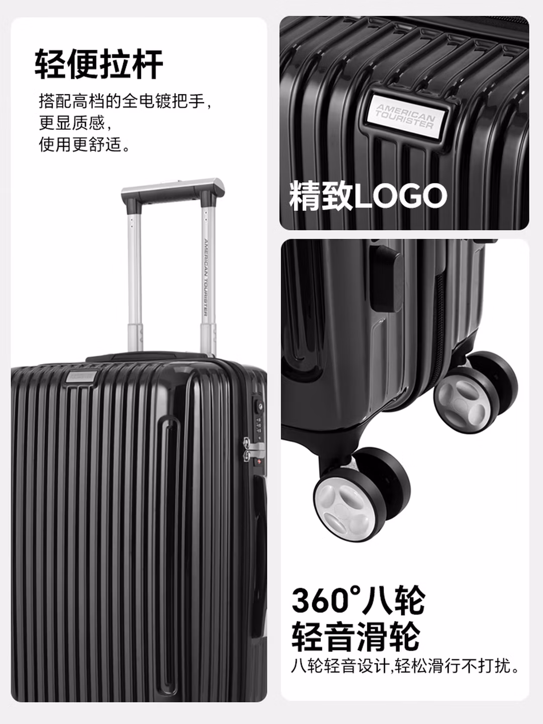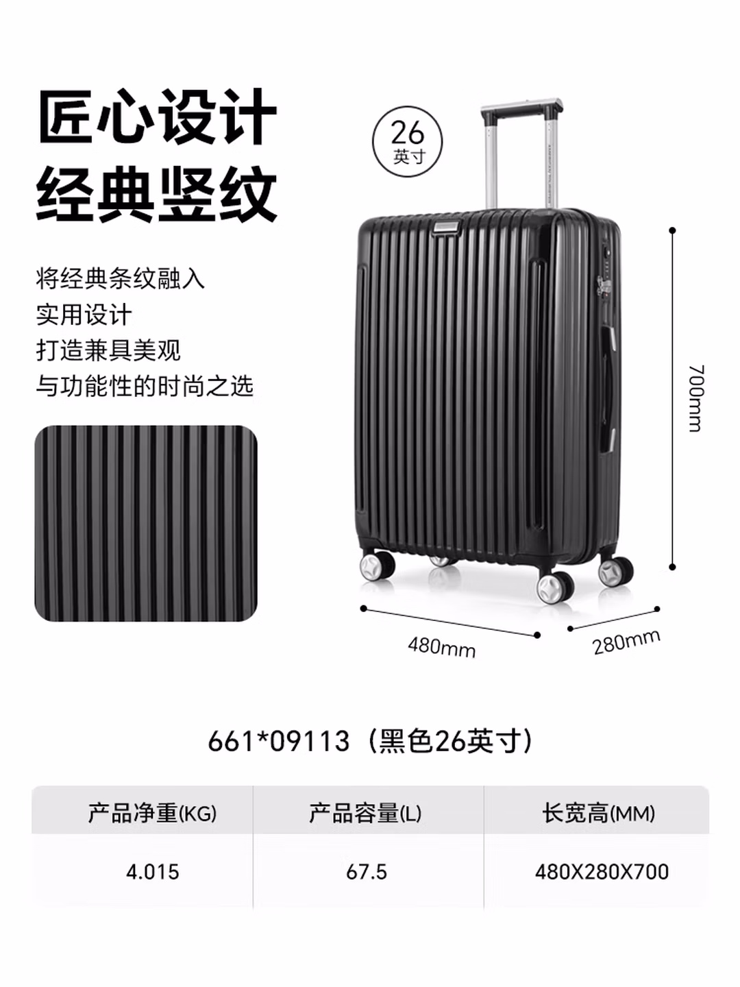 这款American Tourister 美旅 WELLINGTON系列 拉杆箱, PC+ABS材质复合材质,轻便耐用,抗摔抗压有效保护行李安全。将经典条纹融入实用设计,打造兼具美观与功能性的时尚之选 。锁具上印有TSA认证标识,全球大多数国家和地区海关均可识别并使用。 360°八轮轻音设计,轻松滑行不打扰。轻便拉杆搭配高档的全电镀把手,更显质感,使用更舒适。合理分区轻松收纳,让出行都有条不紊。尺寸480x700x280mm,容量67.5L,自重4.015kg。