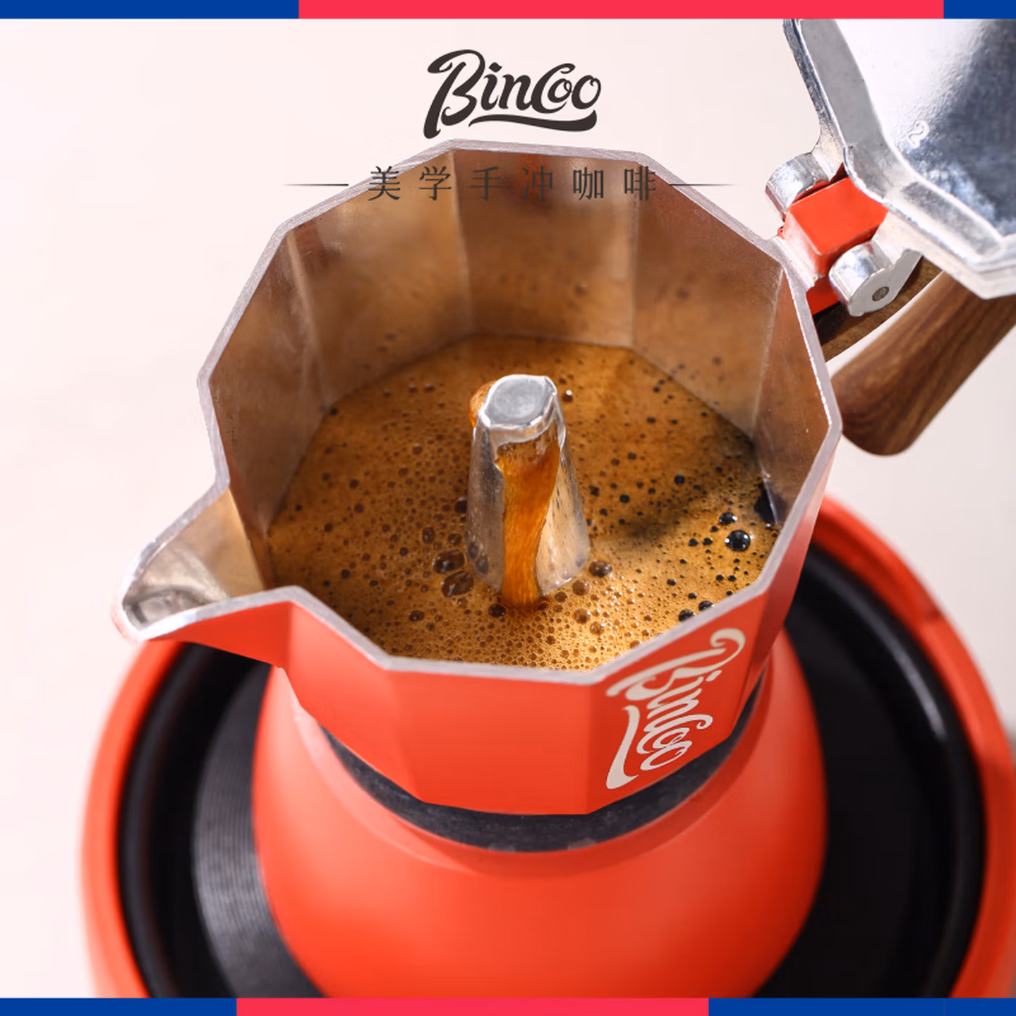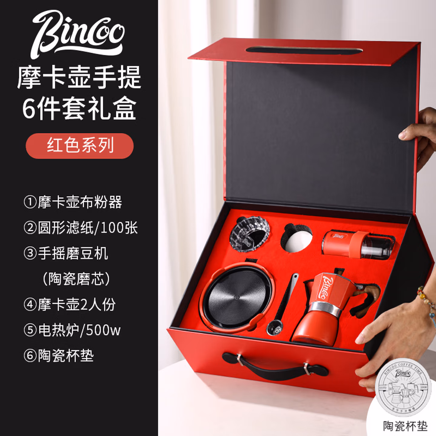 Bincoo 摩卡壶套装 红金礼盒 6件套 HHY-GYKF1186 ,含:摩卡壶布粉器、100张圆形滤纸、手摇磨豆机(陶瓷磨芯)、摩卡壶2人份、500w电热炉、陶瓷杯垫。