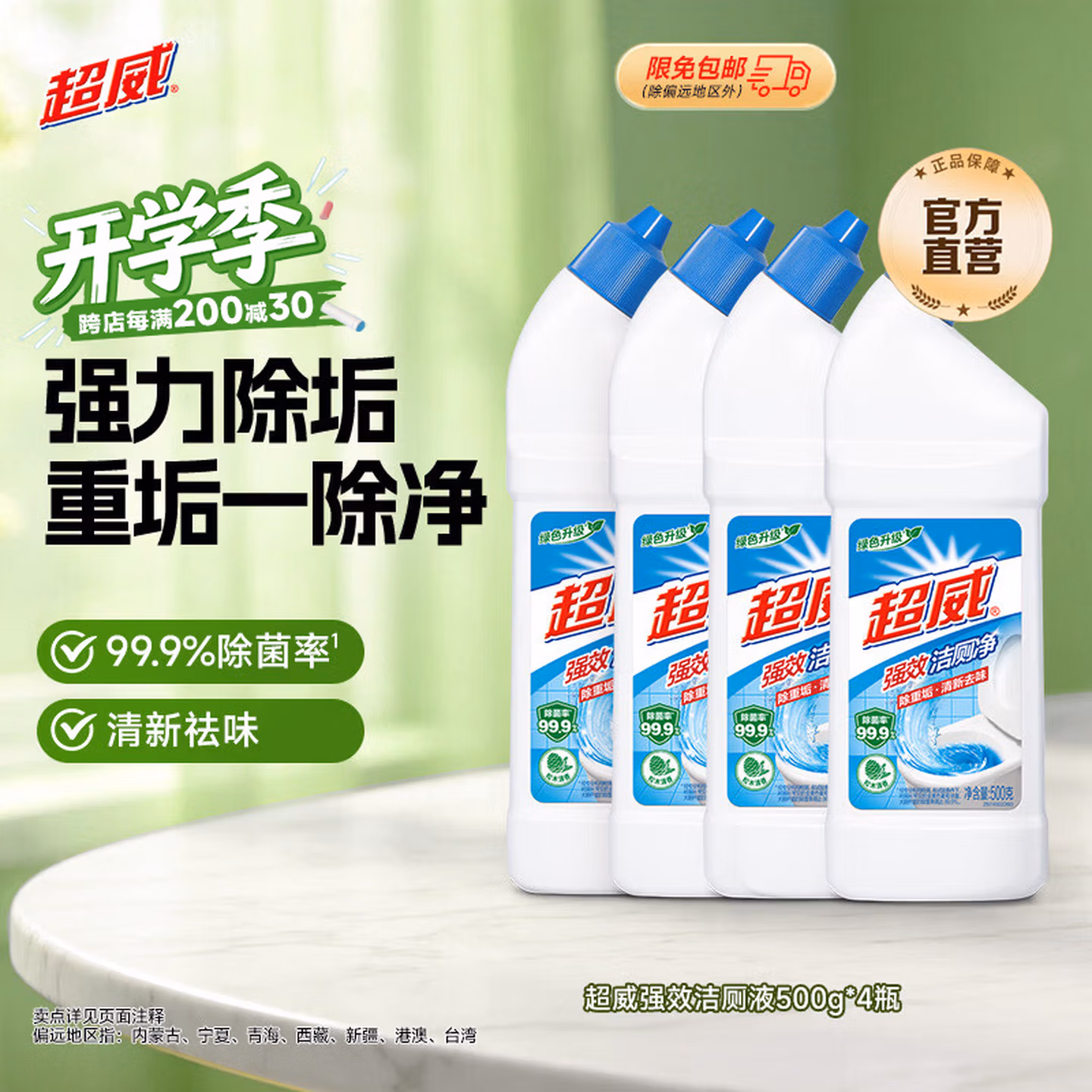 超威 强效洁厕灵 ,效去污因子搭配无机酸配方,轻松瓦解陈年重垢,焕新马桶不费力。99.9%除菌率有效去除大肠杆菌、金黄色葡萄球菌常见致病菌,守护家人健康。浓稠挂壁配方,挂壁持久均匀,360°附着顽垢,持久释放强效洁净力,充分瓦解顽固污垢,无需费力刷洗。配方温和,洁净不伤马桶釉面用后形成保护膜,防止污垢沉积。研选松木香氛,气味清新不刺鼻满室留香,舒适自然。