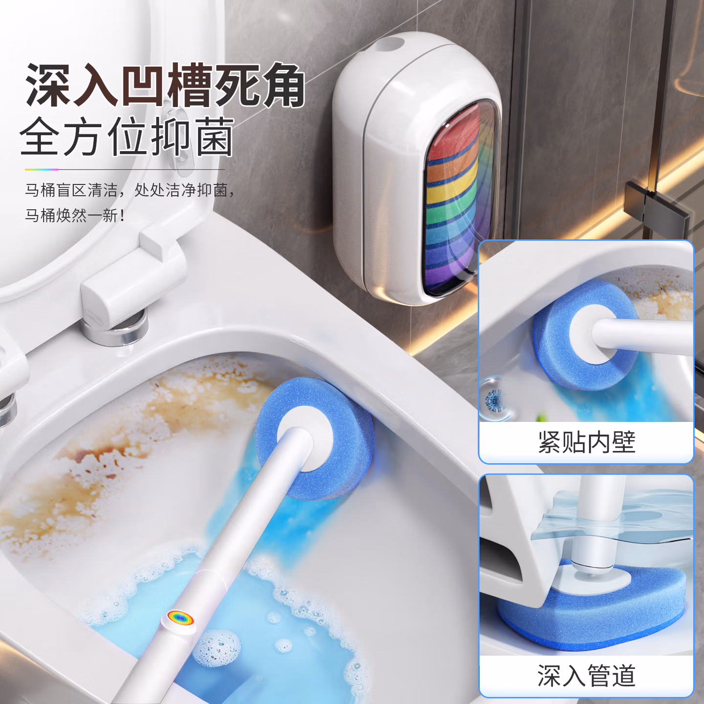 这款佳帮手 壁挂马桶刷 JBS-BGMTS-M03-14P,可深入凹槽死角,深入管道,紧贴内壁,刷头自带清洁液,强力去污,有效防止细菌滋生,全方位清洁抑菌,马桶清洁无盲区。一次性刷头全包裹式半自动开盖抓夹,刷头稳固不脱落,清洁省心更牢固。机械联动式设计,拿起杆子盖子自动打开,放回杆子盖子自动, 无接触取拿。