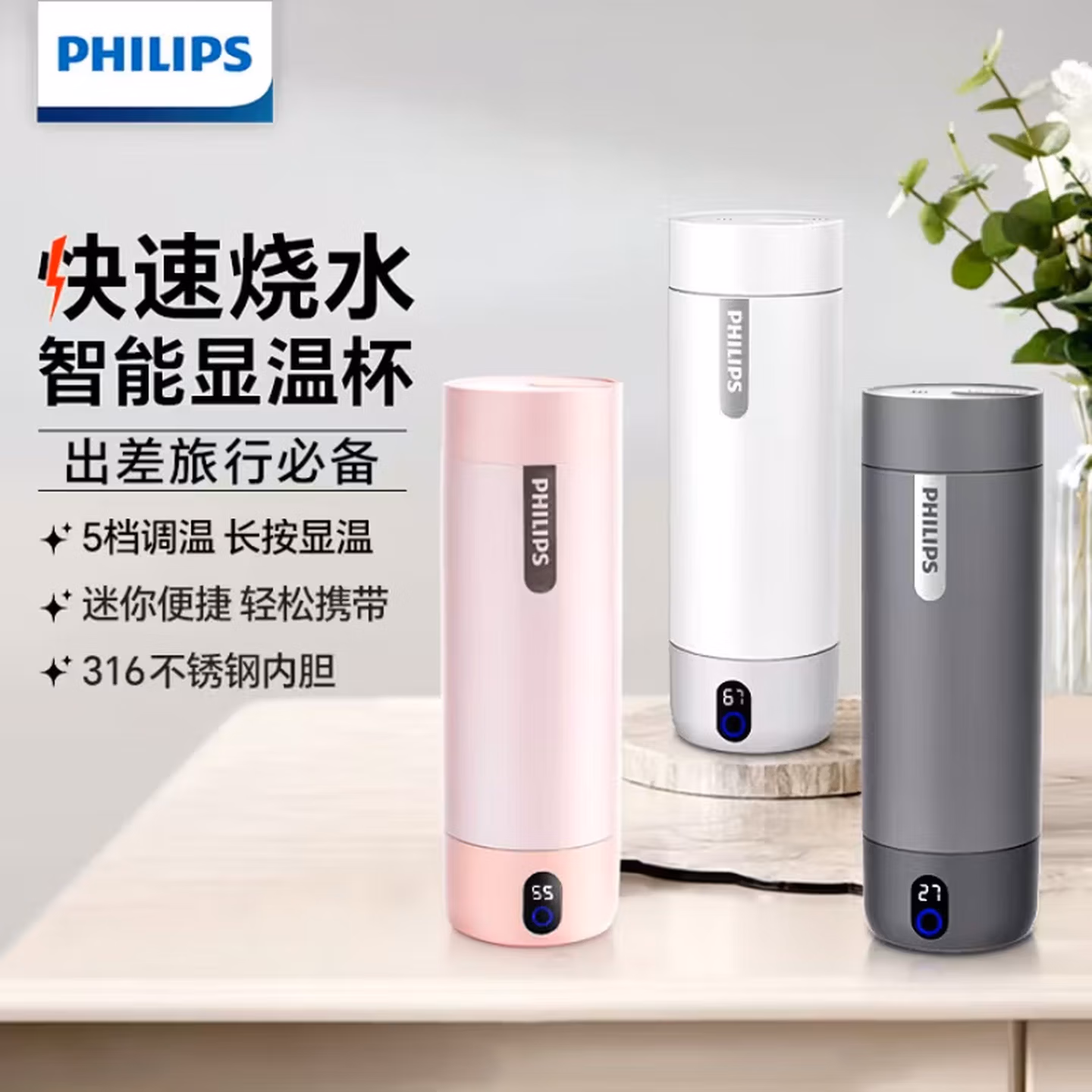 飞利浦(PHILIPS)烧水杯保温杯便携式烧水杯子旅行电加热水杯壶男女士礼物定制款,京东商城好评率98%,现售价¥¥169,领取5折京东优惠券 ,自动国补实付¥76.08包邮。