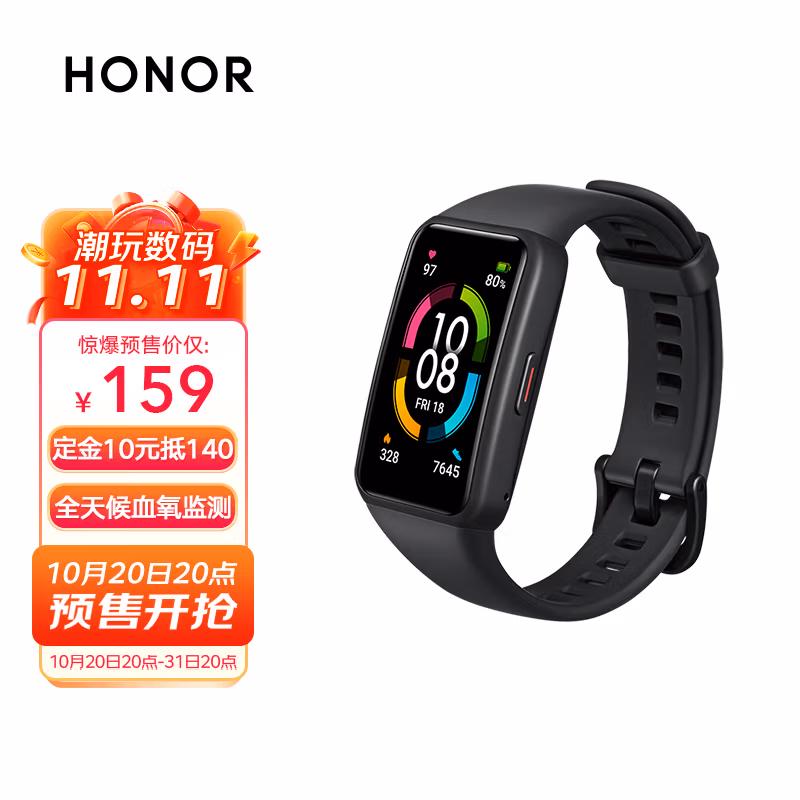 荣耀手环6 全天候血氧监测 95种运动模式 智能手环 运动手环 智能心率 50米防水 陨石黑,京东商城好评率98%,现双11预售价¥198.9,支付10元定金尾款立减¥99,10月31日20点开始付尾款, 实付¥99.9包邮,还可叠加全品类券到手更低,另有NFC版¥159。