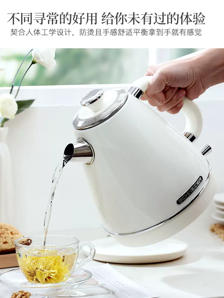 这款SCHNEIDER 施耐德 复古不锈钢电热水壶 1.8L ,1800w大功率,速热沸腾,英国STRIX温控系统,智能感应温度,双重保险防干烧,钢琴烤漆外层,304食品级不锈钢内胆,上盖可取,加水更方便,人体工学设计手柄,防烫隔热,壶口内蜂窝孔滤网,避免沸水飞溅。