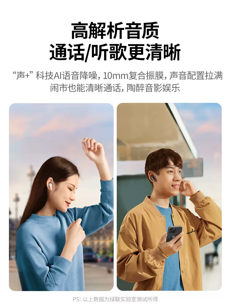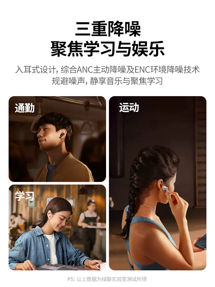 这款绿联 T3 降噪入耳式蓝牙耳机,蓝牙5.2主控芯片,结合SAW抗干扰天线设计,提升抗干扰能力,降低功耗,连接更稳,传输更快。耳机单耳续航7小时,搭配充电仓做到24小时续航,IPX5级防水,运动也可用。支持开盖即连,触控操作。支持音频解码:AAC、SBC,搭载ANC主动降噪,降噪深度达到25dB,拥有普通、通透、环境模式,支持AI通话降噪,内置10mm PU+羊毛纸复合动圈单元,三频均衡。