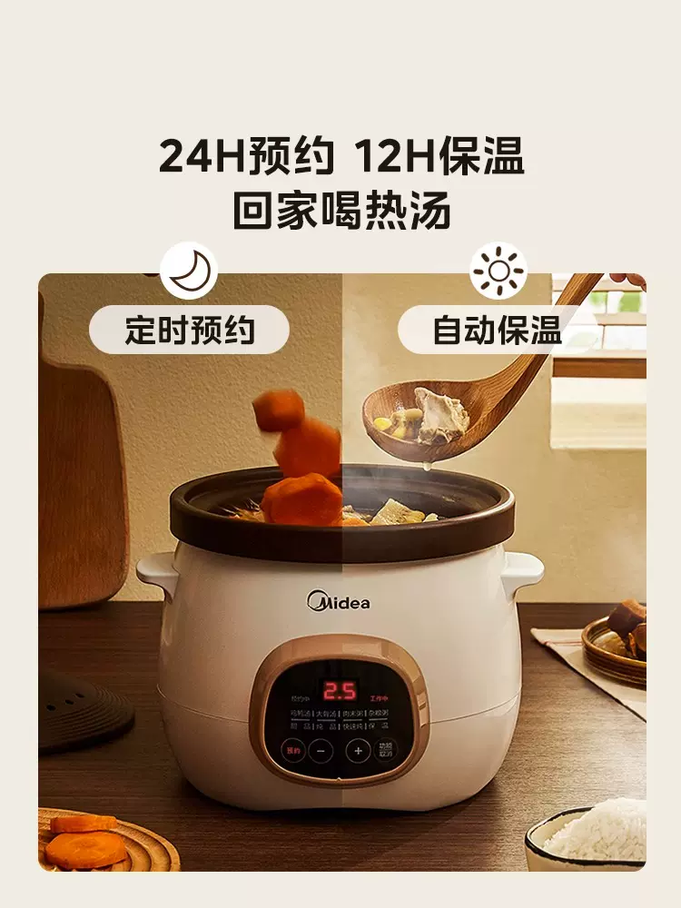 Midea 美的 MD-DG30E203 赤陶内胆 全自动电炖锅,现天猫midea美的麦耶专卖店售价¥339,可领取¥190天猫优惠券,实付¥149包邮。点此搜索更多天猫/淘宝优惠券。 这款Midea 美的 MD-DG30E203 全自动电炖锅,优质赤陶内胆,3C质量认证,温火细熬,安心不溢锅,静音运作,隔水慢炖,6大预设预约功能,塔吉锅盖特有三角圆锥造型,内部形成微压焖煮原汤蒸汽不断循环上升,汤汁愈发浓郁鲜美。