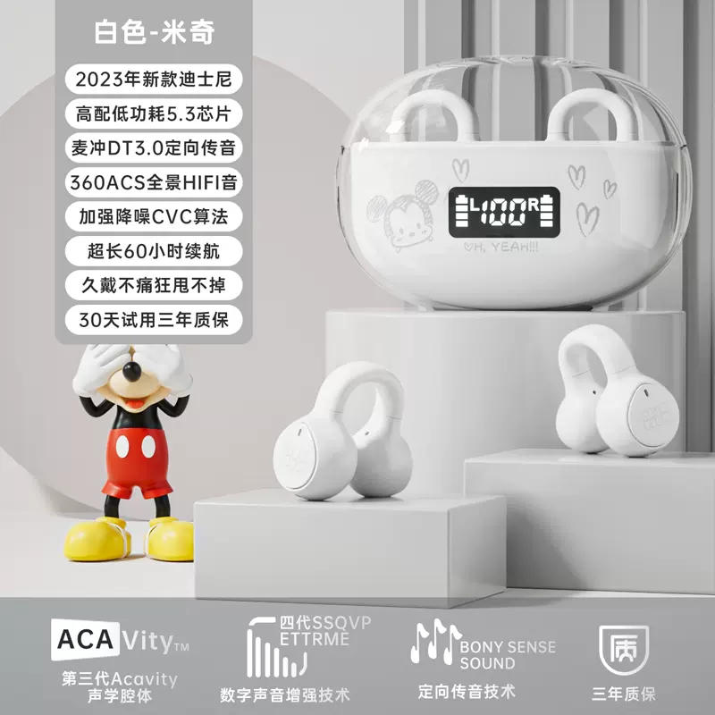 这款Disney 迪士尼 夹耳式蓝牙耳机,夹耳式设计,佩戴舒适,脉冲3.0定向传音技术,10mm单元金属动圈喇叭,360°环绕式发声,三频均衡,HiFi原声音效,AAC高清音频解码,高灵敏麦克风,ENC通话降噪,语音通话更清晰,蓝牙5.3芯片,连接稳定不卡顿。大容量电池(充电仓200mAh,耳机30mAh),续航50h。智能兼容市面主流带蓝牙功能设备,兼容安卓、ios、 win系统连接。IPX5防水,规避汗水渗透。