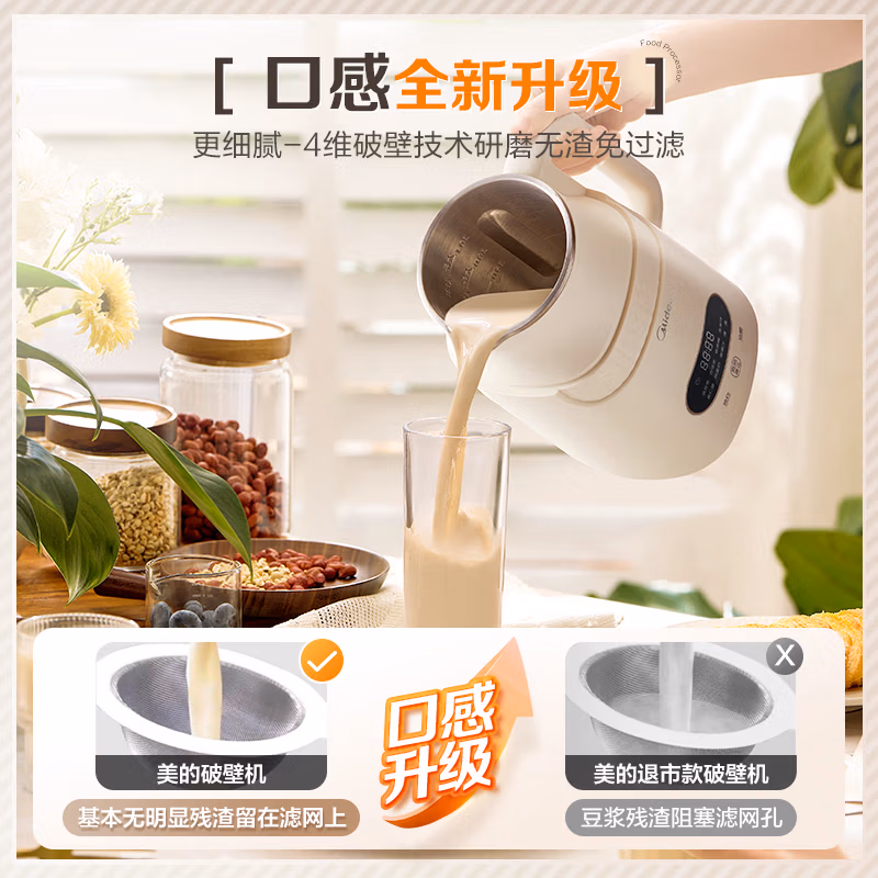 美的豆浆机 家用小型迷你多功能1-2-3人用全自动免煮免洗免过滤破壁机 果汁奶昔榨汁机 新款升级降音罩 乳白色,京东商城好评率100%,现美的衣物消毒机旗舰店售价¥329,参加¥170-30活动,参加跨店每满¥200-30满减,领取¥70京东优惠券,实付¥199包邮。 Midea 美的 DJ10B-BL8086C 家用小型豆浆机 1L,304不锈钢内胆,食品级材质更安心,精钢八叶刀,立体粉碎,搅打细腻,加厚隔音罩,降噪隔音防烫伤,生熟双磨豆浆,满足多样口感需求,七大花样菜单,冷热皆宜不重样。