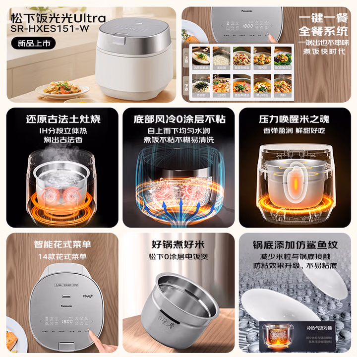 这款Panasonic 松下 SR-HXES151-W 饭光光旗舰款 Ultra IH电饭煲,0涂层医用级316L不锈钢内胆,通过特殊工艺处理实现物理防粘,彻底消除涂层脱落隐患,支持钢丝球擦洗和洗碗机清洁。内胆底部设计仿鲨鱼纹路,减少米粒粘连,实测清洗耗时仅需30秒。