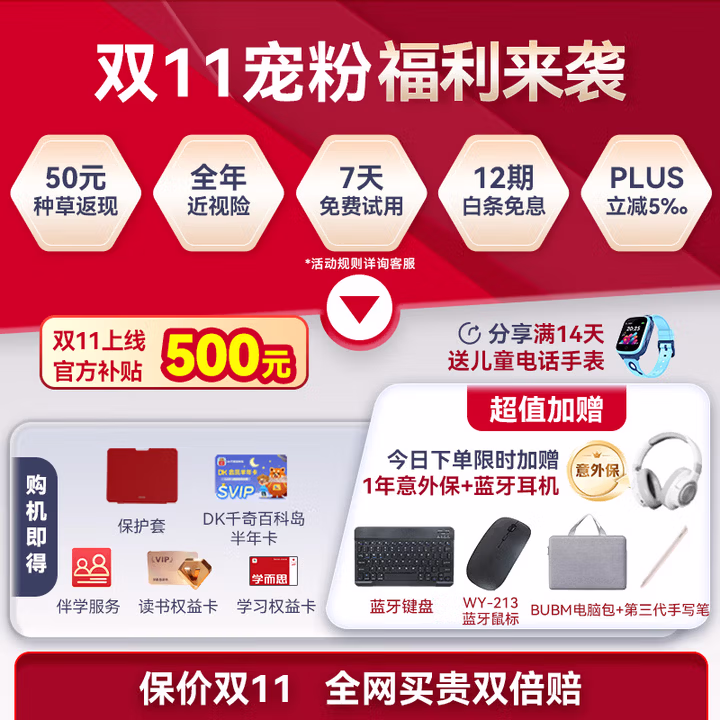 学而思学习机T4【2025新款】三种智能场景开启AI学习新方式学习平板全学段 13.2英寸 8+256GB,京东商城好评率95%,现售价¥6499,参加满6000元减500元优惠活动,领取¥400京东优惠券,可领3000-150元惊喜红包(200-20超级红包膨胀之后可得!每天都可连续膨胀3次,基本必得),Plus会员实付¥5217.51元包邮,今日下单加赠1年意外保1年延保+错题打印机,第三代手写笔,DK半年年卡,保护套,权益卡,读书app权益卡。