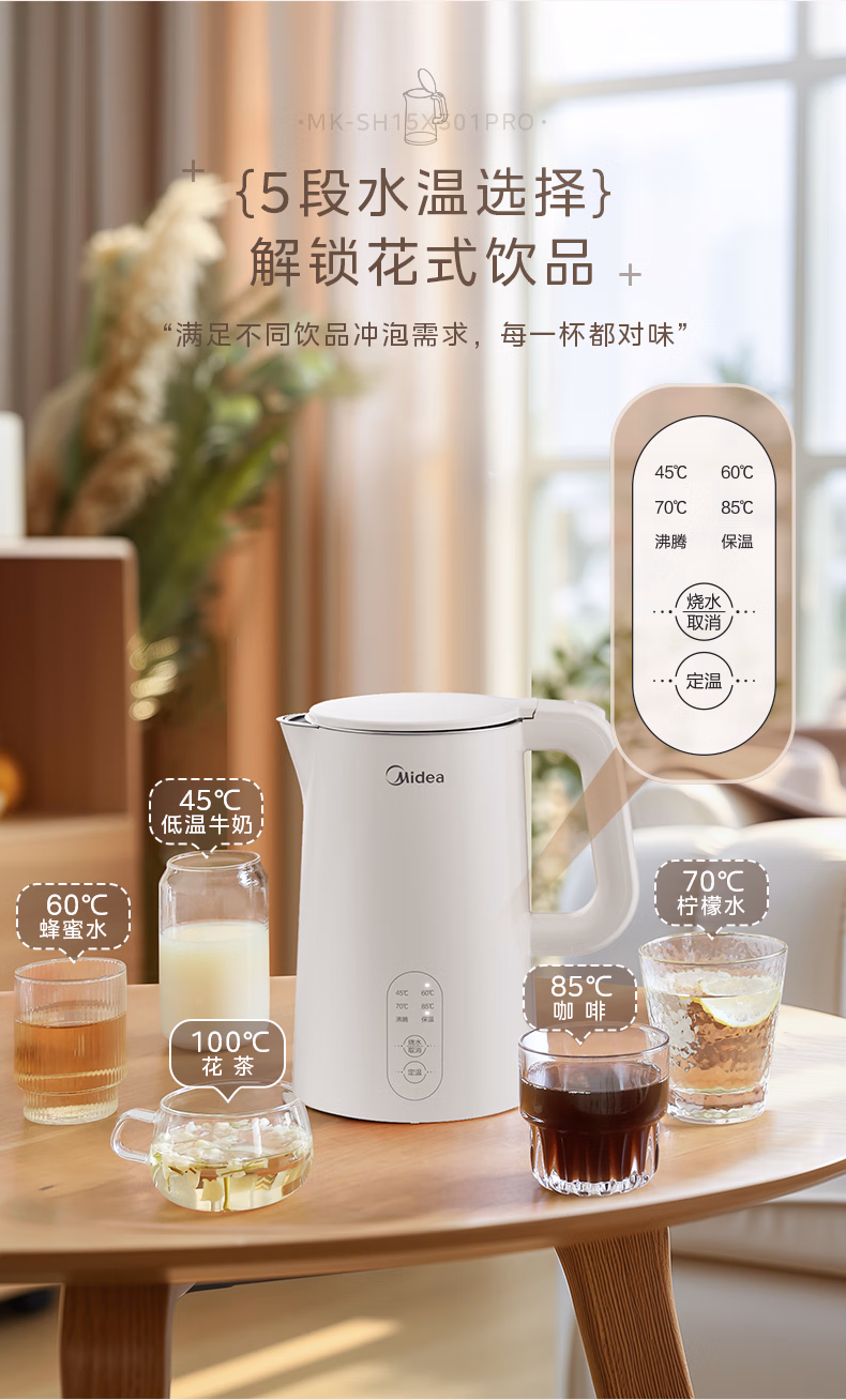 Midea 美的 SH15X301 电热水壶 ,1500W速热,暖饮快速送达。304不锈钢一体无缝内胆,0塑料全钢水路,5段温控,选择满足不同冲泡需求。两种烧水模式,鲜活好水随心饮。双层隔热,贴心不烫手。二段阻尼开盖设计,防止水珠飞溅烫伤,1.5L容量,大口径更易清洁。
