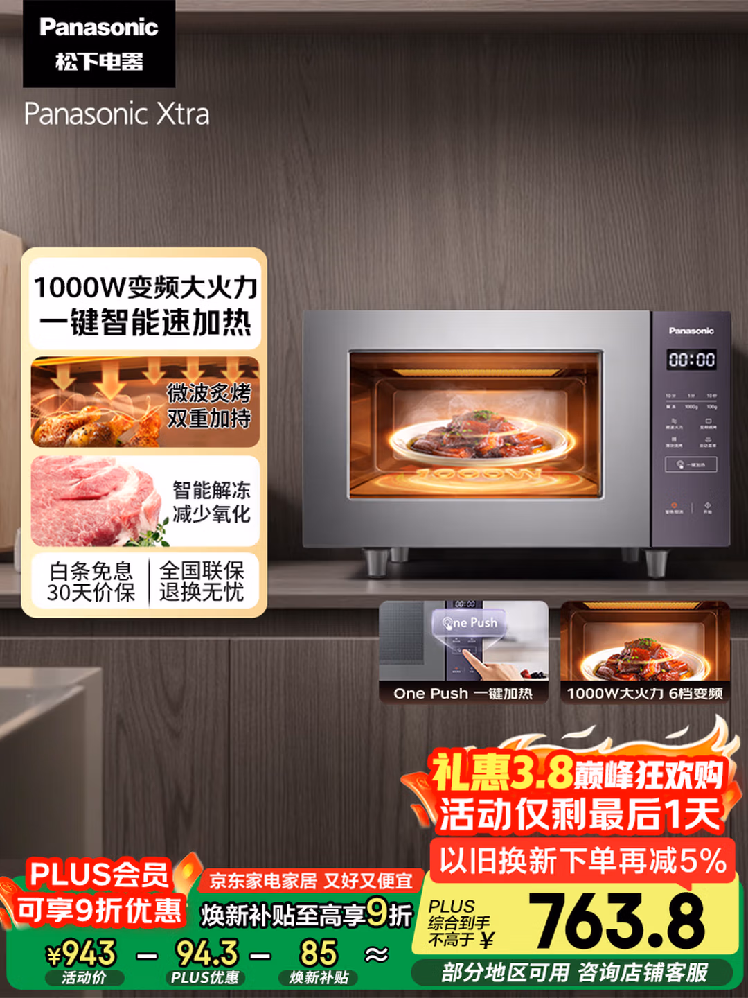 松下(Panasonic)【国家补贴】Xtra蔓越莓微波炉电烤箱一体机多功能家用平板式1000W感温加热6档变频22升容量GF231Q,京东商城好评率99%,现 售价¥923 ,领取9折京东优惠券, Plus会20点可抢800-80神券(仅限今日可用),首购礼金41元,详情页选择以旧换新可补贴5%(旧品选个护健康-剃须刀-其他,无残值无需回收),结账使用京东支付可国补实付¥561.39包邮 。