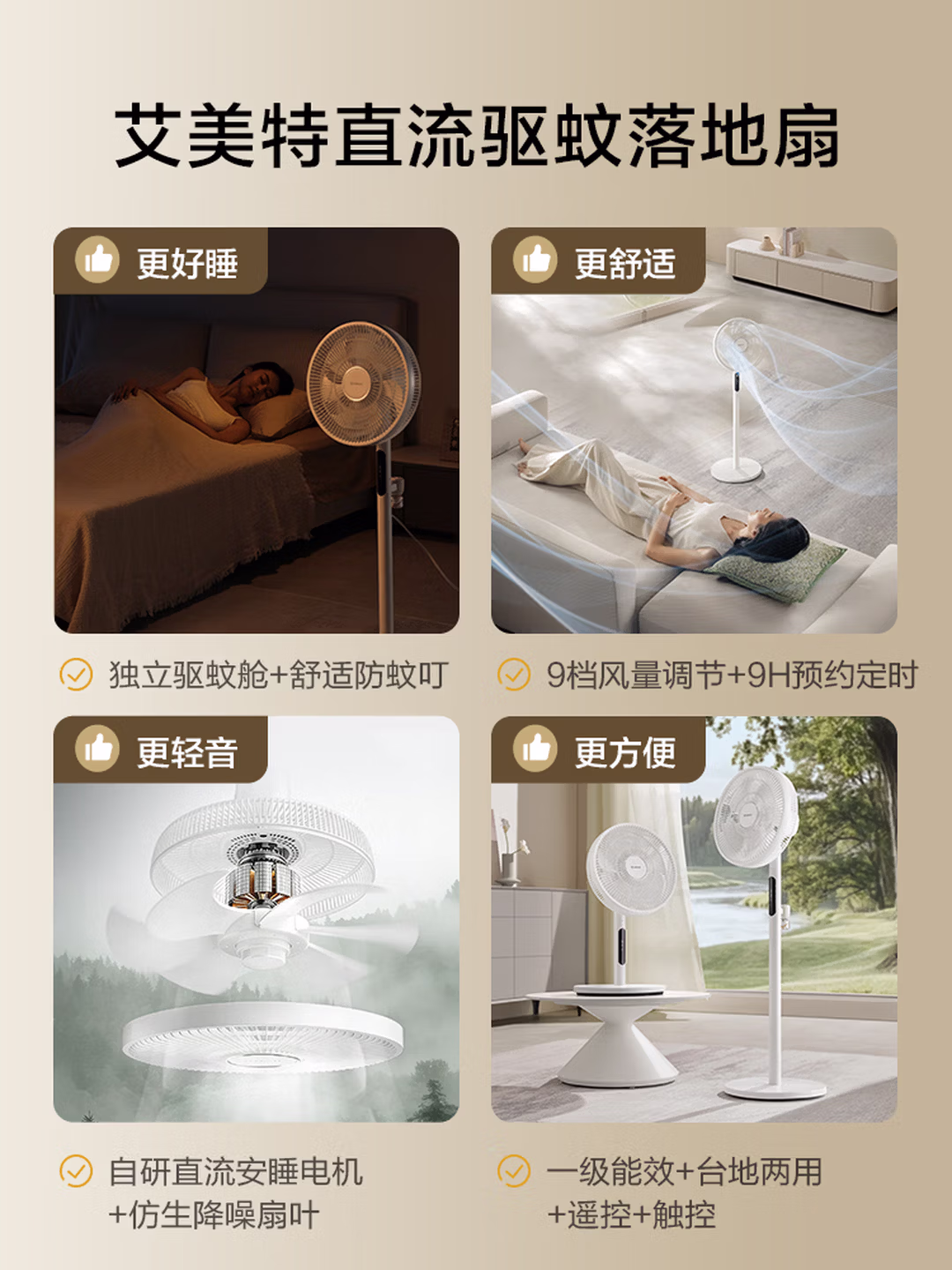 独立驱蚊器模块,可替换驱蚊液,含0.8%±0.2%氯氟醚菊酯,无香无刺激,更温和更安全,蚊子无处落脚。9档风量调节,老人小孩都有舒适风。左右自动摆头,远程遥控无需起身控制,躺在沙发上就能调风速。头部预组装,0工具安装,新手友好操作无难度。