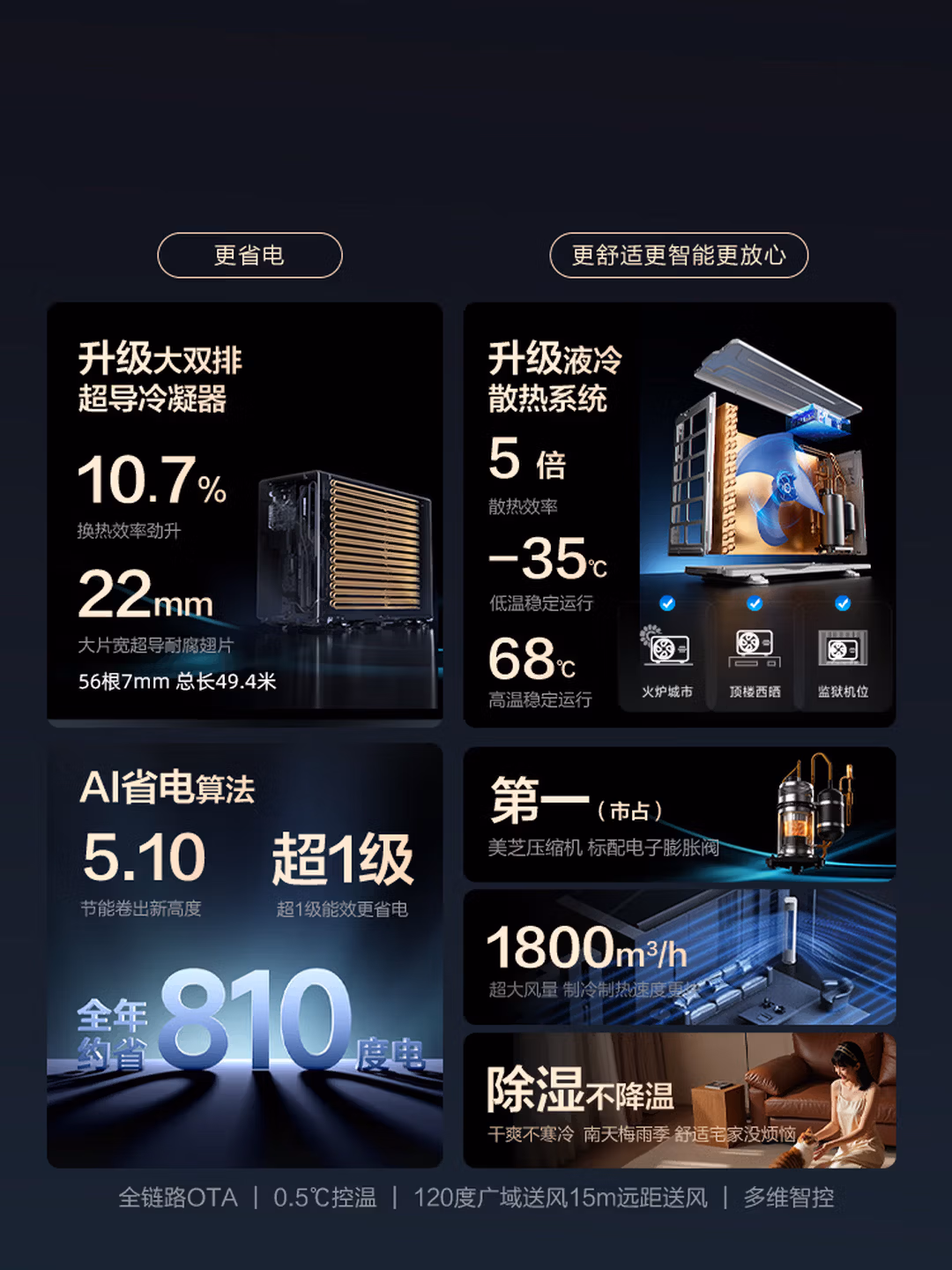 1800m³/h的超大循环风量结合上下左右立体扫风,避免了直吹带来的不适感。47dB(A)的低噪音运行配合智能睡眠模式,夜间可自动调节风速与温度,营造静谧的休憩环境。搭载的68℃高温制冷和-35℃低温启动技术,即便面对极端气候也能稳定输出,解决了传统空调在监狱机位或顶楼场景下的性能衰减痛点。