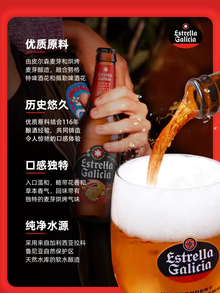 这款Estrella Galicia 埃斯特拉 兔年经典款精酿拉格黄啤酒,传统方法和现代技术精制而成,具有独特的风味。总生产时间将近1个月,其中一半时间在熟化罐中,原料为水、麦芽、玉米、啤酒花,酒色呈金黄色,带有浓郁的麦芽与干果香味,苦味突出且独特,具丰富迷人的酒香,是个性鲜明的啤酒。 原麦汁浓度13°P,酒精度5.5%vol。