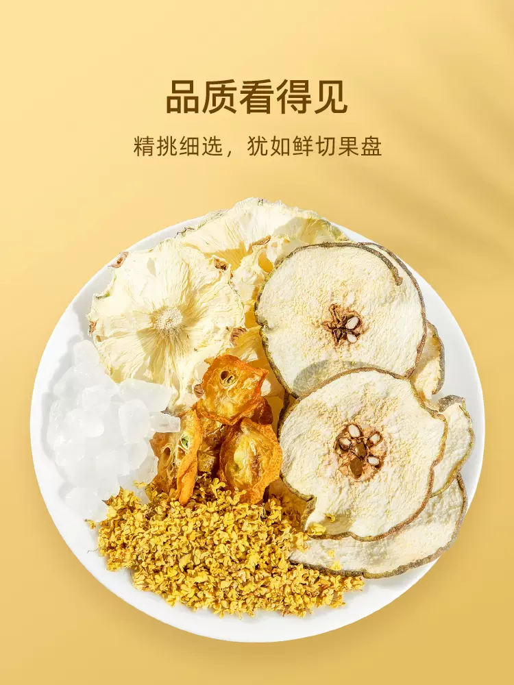 这款艺福堂 金桔桂花冰糖雪梨茶 ,精选适季短果枝梨甘酸多汁,含有B组维生素,采用低温缓慢烘干技术,保留水果原色,多种植物水果协同搭配,滋润,芳醇,清透,一袋多泡,完整鲜切果片,成分与视觉兼得,营养看得见。