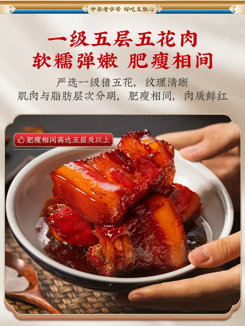 同庆楼 四大招牌菜之一 红烧肉,严选一级猪五花肉,肥瘦相间,层次有5层及以上瘦肉,肥瘦分布均匀,比普通三层瘦肉的猪五花口感更细腻,大厨秘制配方,反复调整配料搭配,色香味香醇味美,自己在家加热就能享受门店同款美味,免洗免切,省心省力。