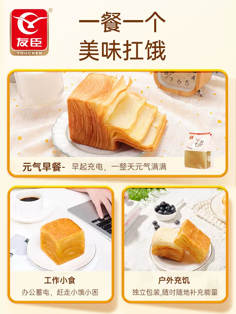 友臣 牛乳千层吐司面包,现天猫 友臣旗舰店 售价¥25.8,可领取¥6天猫优惠券,实付¥19.8包邮。点此搜索更多天猫/淘宝优惠券。 这款友臣 牛乳千层吐司面包,高筋小麦粉、鸡蛋、新西兰进口奶粉、安佳黄油为原料,浓郁牛乳香,24层起酥,低温发酵,口感松软绵密。