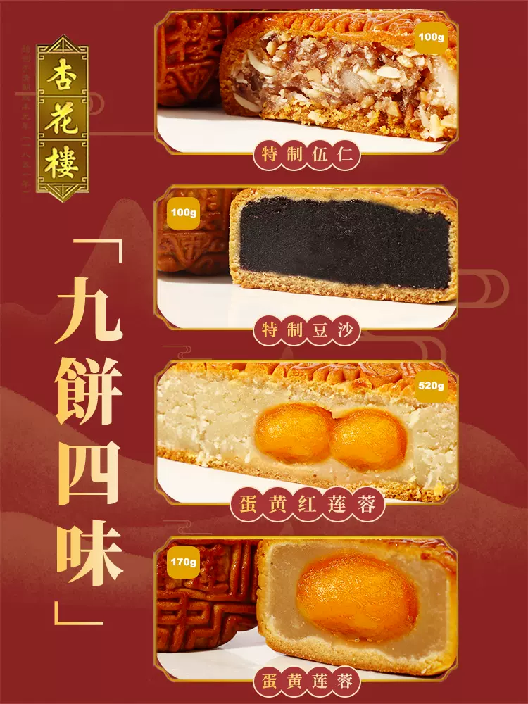 杏花楼创建于清代咸丰元年1851年,杏花楼月饼登陆上海近百年,其传统的豆沙、莲芸、椰蓉、五仁已成为"四大金刚",多年蝉联"国饼十佳"的业界最高荣誉。
