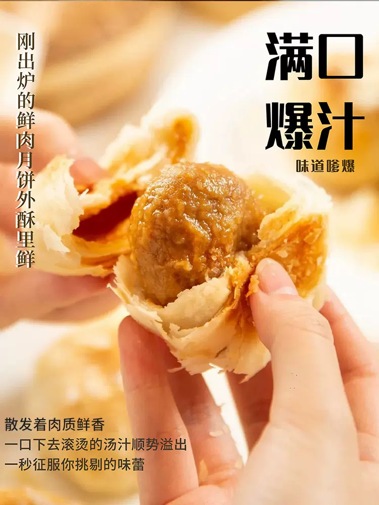 这款真尝家 豫园德兴馆 联名 爆汁鲜肉月饼生胚 ,可以自己在家用烤箱/平底锅/空气炸锅再加工一下,口感更新鲜,外皮酥到掉渣,口感脆粉中带一点韧,肉香味浸入酥皮,肉馅饱满多汁,一口下去汤汁迸发 。