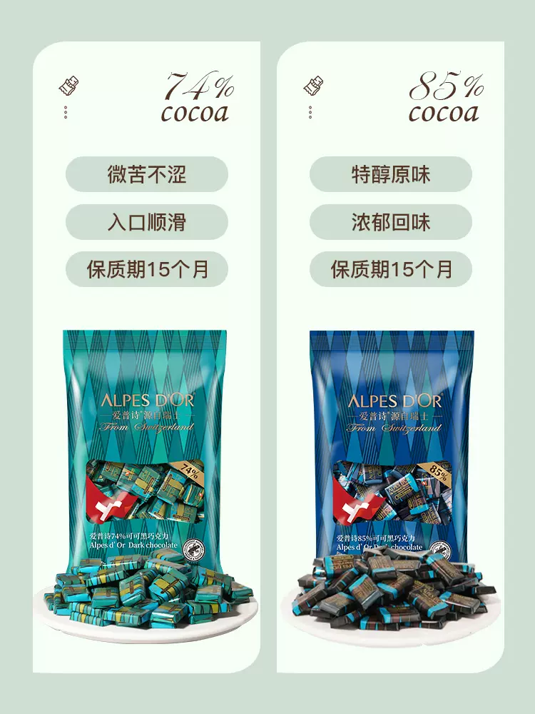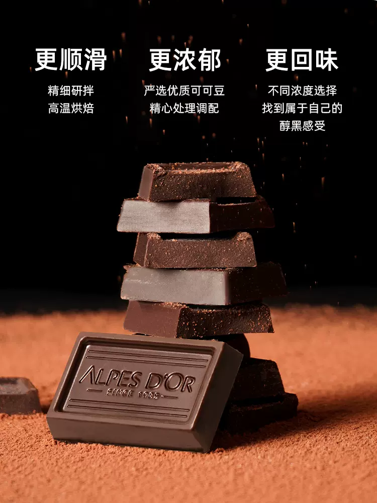 这款Alpes d'Or 爱普诗 黑巧克力,产地瑞士。采用西非出产雨林联盟认证的可可豆制成的天然可可脂,不含低端巧克力使用的代可可脂;外形整齐,表面光亮、平滑,香气怡人,口感丝滑浓郁,口溶性好。
