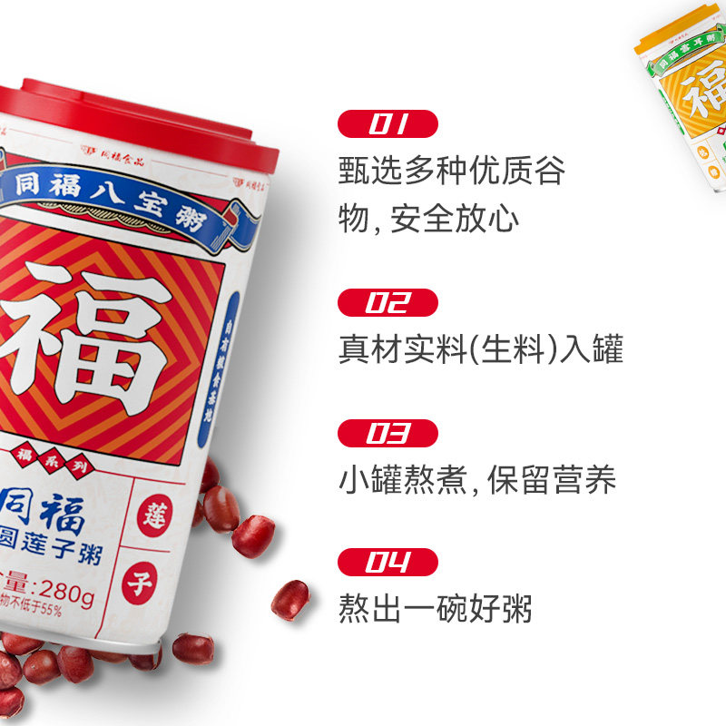 同福 福系列 桂圆莲子八宝粥 ,现天猫 同福食品旗舰店 售价¥36.8,可领取¥17天猫优惠券,折后¥19.8包邮。点此搜索更多天猫/淘宝优惠券。 这款同福 福系列 桂圆莲子八宝粥,精选大米、莲子、绿豆、黑米、红小豆、燕麦米、红花生等谷物杂粮,科学黄金配比,膳食营养均衡。
