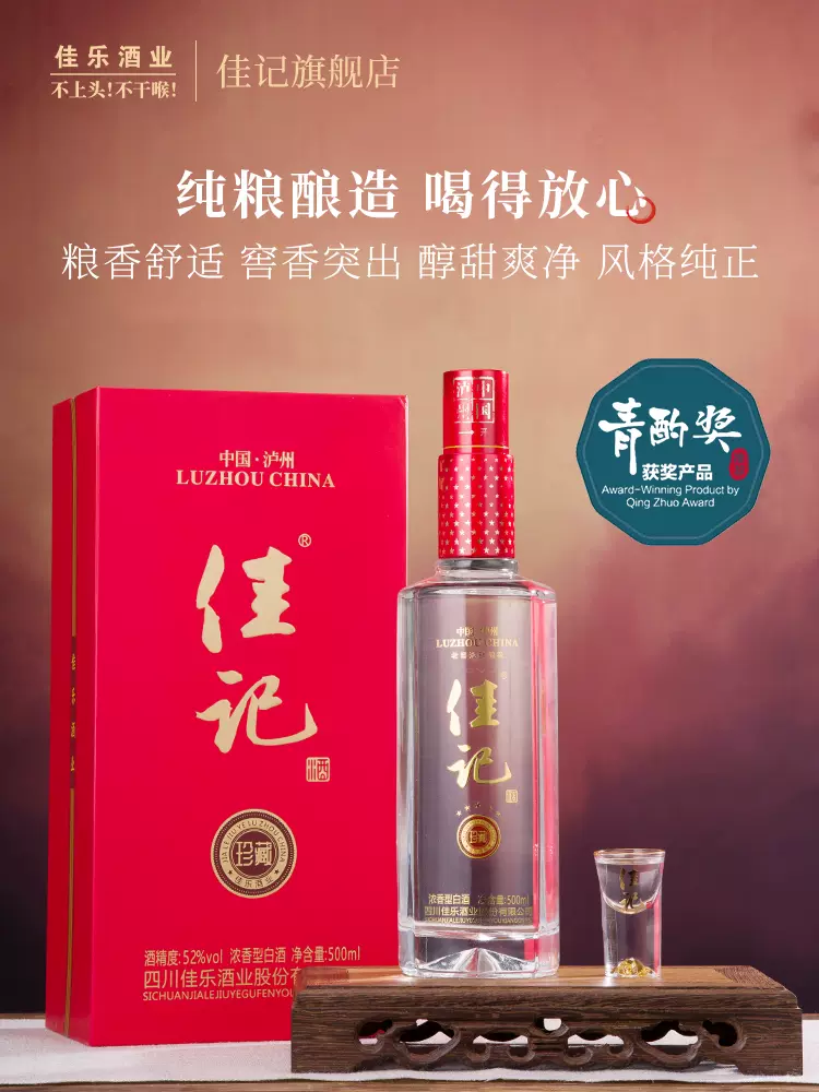 这款佳记 珍藏浓香型白酒,获酒业权威“奥斯卡奖”之称的2022年度青酌奖,是泸州佳记酒业于2019年推出市场的一款浓香型白酒产品,以非遗级“泓立槽坊酒传统酿制技艺”为基础,口感有“无色透明、窖香幽雅、陈味舒适、醇厚绵甜、香味协调、回味悠长、风格典雅”等特点。