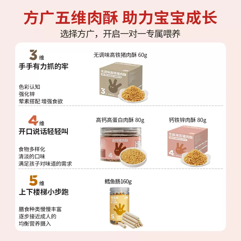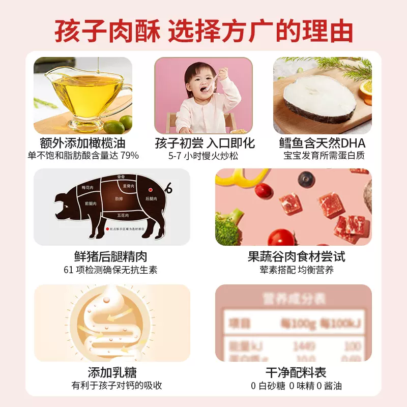 方广 儿童芝麻海苔猪肉酥,现天猫方广官方旗舰店 56g 售价¥40,下单6件领取¥240-177天猫优惠券,叠加跨店满减,实付¥39包邮,折合¥6.5/件。点此搜索更多天猫/淘宝优惠券。 方广是国内婴幼儿辅食的老品牌,这款方广 儿童芝麻海苔猪肉酥,选用猪肉精华部分-新鲜猪后腿肉,精制工艺,慢工做出好肉酥。肉酥工艺反复研磨,安心无调料。精细纤维,入口酥薄好消化。