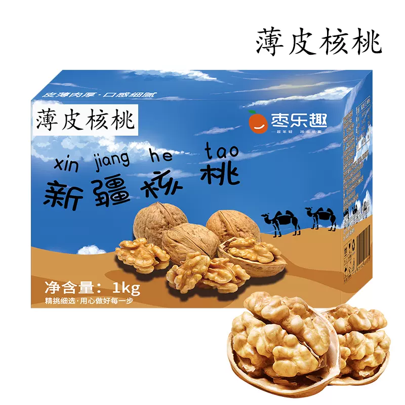 这款枣乐趣 薄皮核桃,选用当季新鲜新疆阿克苏核桃,果肉香醇,自然生长不进行人工催熟,经过人工层层筛选,果仁粒大饱满。
