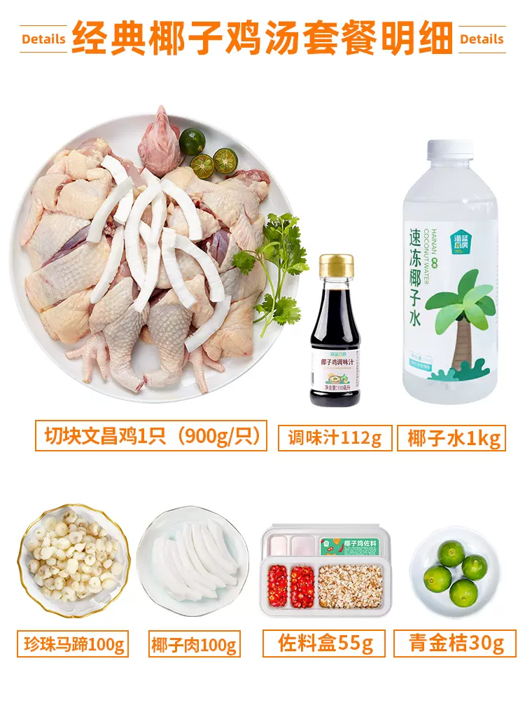这款海蓝厨房 海南椰子鸡 ,精选选海南文昌鸡,原生态放养环境--海南文昌,无拘无束的户外乡野生活,每天每天穿梭在乡野灌木丛间肆意奔跑,野外生活满足120天后才回归温室,用40天的时间圈养,早晚辅食,逐日养成健美紧实的好鸡肉。天然可口的树上甘露--椰子水,新鲜采摘,无污染。