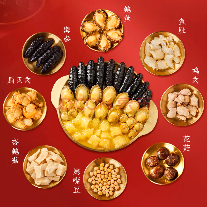 天海藏 加热即食10参10鲍大盆菜 佛跳墙,采用整只海参、整只鲍鱼、花胶、鲍螺、扇贝柱、牛蹄筋、花菇、杏鲍菇为原料,胶质丰富有营养,新鲜滋补,口感弹嫩,1斤原料熬制1斤汤,古法工艺熬制12小时,几十种食材高汤熬制,汤汁浓郁有营养,皇室贵族风格配色与花纹宫廷盏包装,满满中国风,送礼更有面。