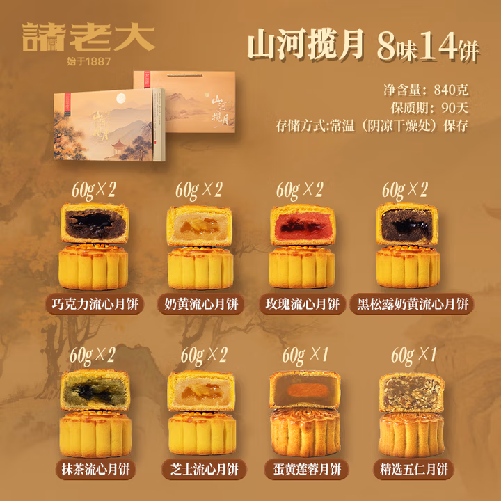 诸老大月饼礼盒 中华老字号 中秋礼盒豆沙月饼莲蓉月饼广式月饼中秋礼品 【25新款大包装】广式月饼14饼840g,京东商城好评率100%,现诸老大官方旗舰店售价¥118,买一赠一,可领取¥39京东优惠券,实付¥79包邮。 诸老大,始于1887年(清光绪十三年),是迄今可考的最悠久粽子品牌,被民国陈立夫称为“粽子状元”。也是中国粽子行业专业型粽子企业仅有的两个中华老字号品牌之一。