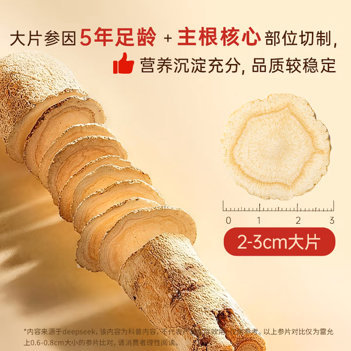 这款 雷允上 加拿大进口西洋参 ,5年足龄生长加拿大西洋参为原料,主根核心部位切制,营养沉淀充分,品质较稳定,皂苷含量4.1%,超标准105%,2-3cm大圆片,传统晾晒结合低温慢烘,保留营养。