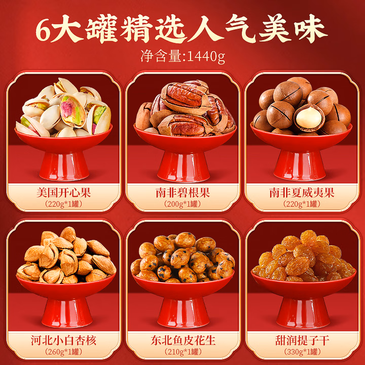 这款沃隆 团圆瑞礼 坚果礼盒 6罐共1440g ,含美国开心果220g*1罐+南非碧根果200g*1罐+南非夏威夷果220g*1罐+河北小白杏核260g*1罐+东北鱼皮花生210g*1罐+甜润提子干330g*1罐。