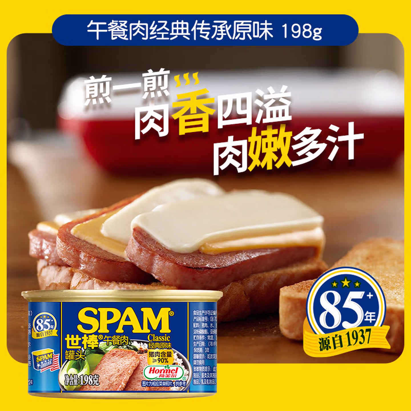 世棒(SPAM)午餐肉罐头198g/340g*4罐装即食火腿儿童早餐速食快手菜火锅食材 清淡198g*4罐+经典198g*2罐,京东商城好评率98%,现 世棒旗舰店售价¥119元,满1件减30元,领取¥30京东优惠券 ,实付¥59包邮。