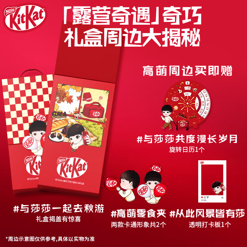 雀巢 【孙颖莎同款】奇巧 巧克力"露营奇遇"礼盒288g 新年 含透卡日历,京东商城好评率99%,现售价¥99.9,单品满1件9.5折,参与2件9.4折活动,下单2件实付¥88.82包邮。 这款雀巢 KitKat 奇巧 露营奇遇 巧克力礼盒,内含威化牛奶巧克力*12+威化黑巧克力*6+草莓味*6,以及透卡日历等周边,新年氛围感好礼。