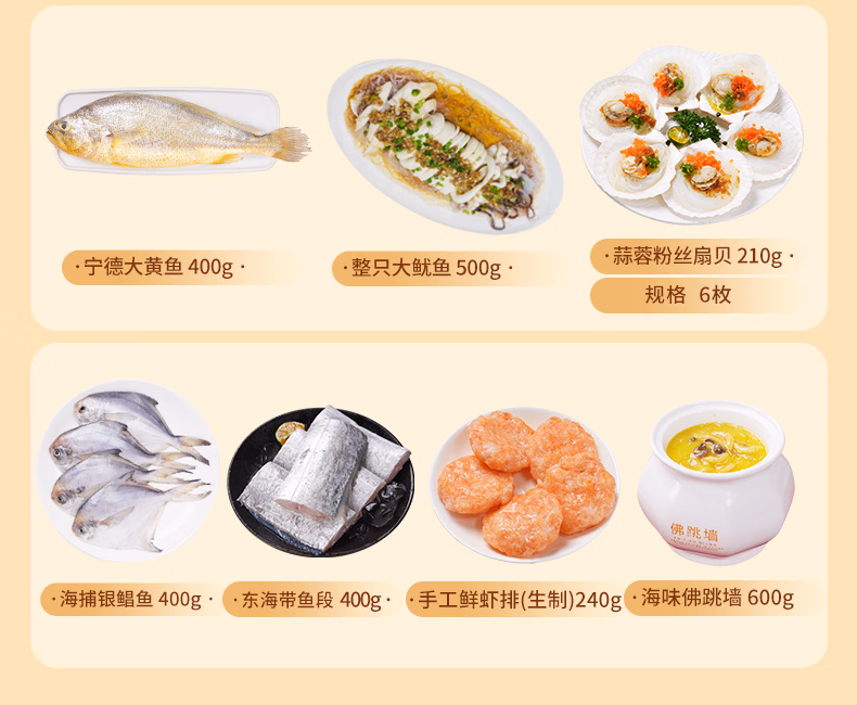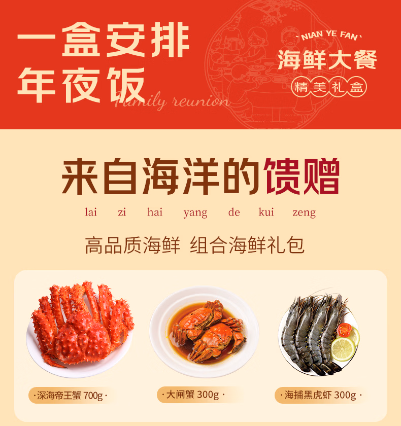 【现货】鲜京采 年货海鲜礼盒 含帝王蟹黄花鱼大闸蟹带鱼等10种8.1斤 生鲜大礼包,京东商城好评率99%,现百亿补贴特价¥398,可叠加满1享9折惊喜红包(200-20超级红包膨胀可得,每天可膨胀3次),首购礼金 10元,Plus会员实付¥328.3包邮。 这款鲜京采 年货海鲜礼盒,内含帝王蟹700g、大黄鱼400g、大闸蟹300g、东海带鱼段400g、黑虎虾300g、银鲳鱼400g、蒜蓉粉丝扇贝210g、海味佛跳墙600g、整只大鱿鱼500g、手工虾排240g。
