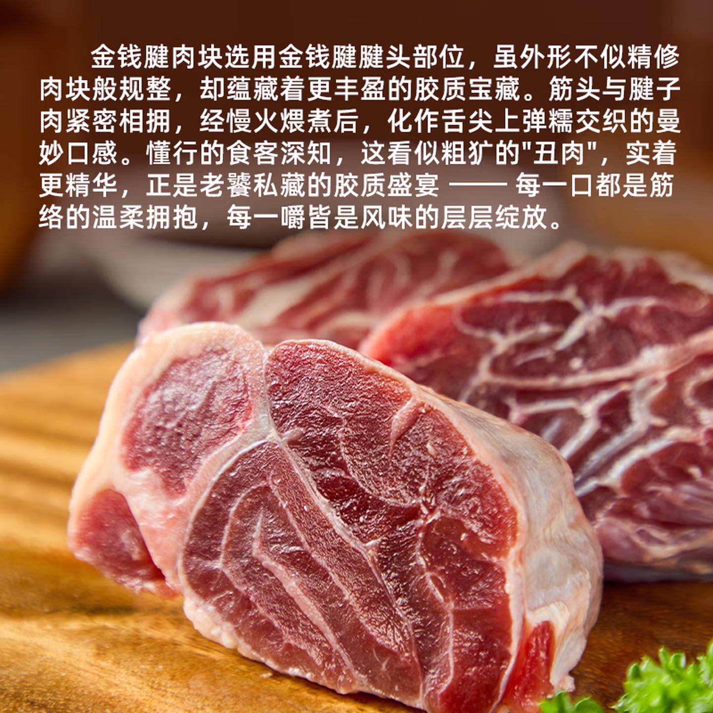 天萃庭澳洲金钱腱肉块980g赠五香老卤汁120g带筋牛腱子看似边角实则精华,京东商城好评率100%,现1号会员店售价¥89.9元,1件7.7折,实付¥69.22包邮,约合¥35/斤。 这款天萃庭 澳洲金钱腱肉块牛肉块,选用金钱腱腱头部位,虽外形不似精修肉块般规整,却蕴藏着更丰盈的胶质宝藏。筋头与腱子肉紧密相拥,经慢火煨煮后,化作舌尖上弹糯交织的曼妙口感。懂行的食客深知,这看似粗犷的"丑肉",实着更精华,正是老饕私藏的胶质盛宴--每一口都是筋络的温柔拥抱,每一嚼皆是风味的层层绽放。