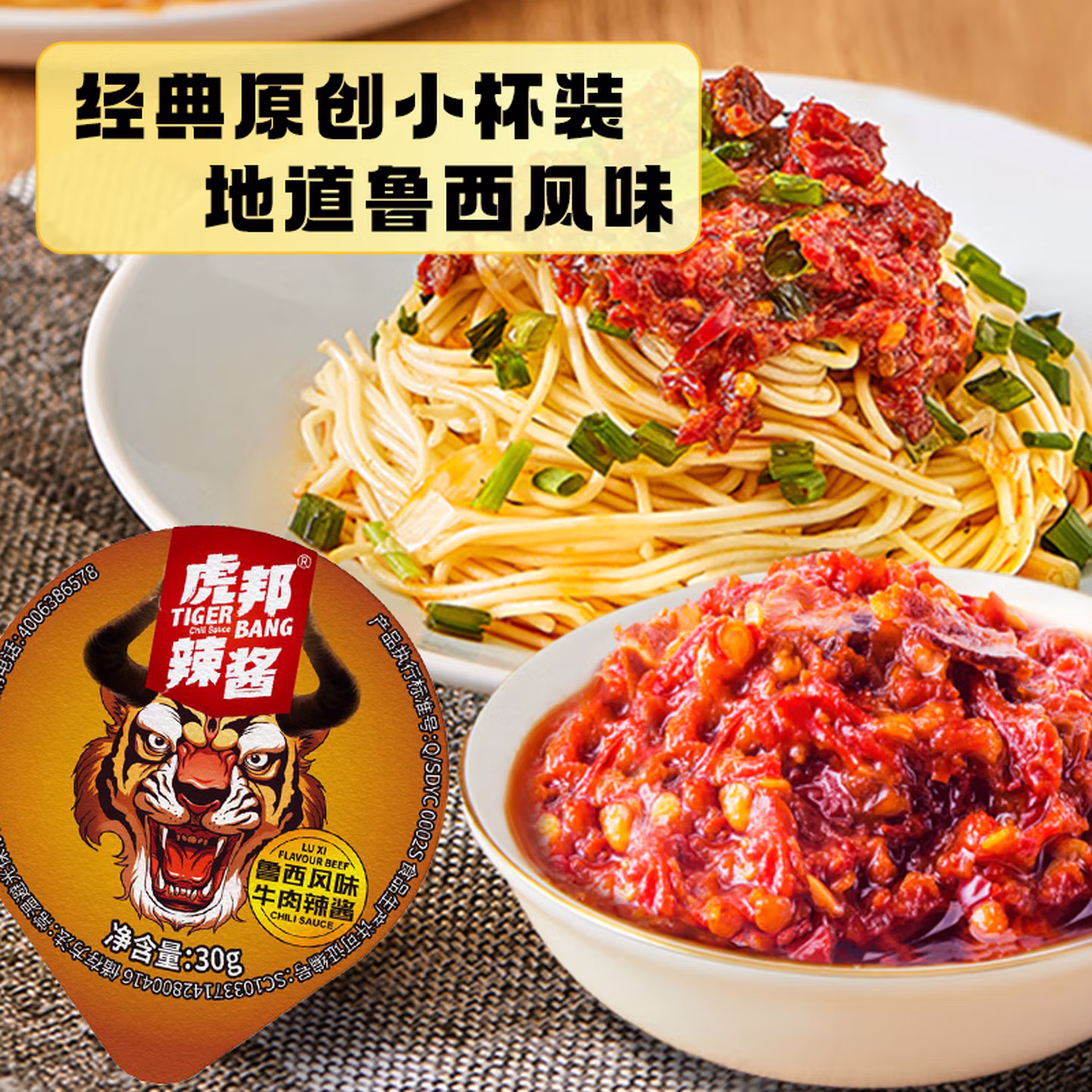 虎邦鲁西牛肉蒜蓉辣酱外卖便携装香辣鲜辣下饭拌面调味蘸料辣椒酱 鲁西牛肉30g*6杯+蒜蓉30g*6杯,京东商城好评率99%,现虎邦食品旗舰店售价¥25.45,下单4件领取¥72京东优惠券 ,实付¥29.8包邮。 这款虎邦 鲁西牛肉辣酱,选用自山东鲁西黄牛肉,肉质细腻营养丰富,风味鲜美可口独具特色。上乘紫皮大蒜,精选优质植物油,黄河流域鲜辣椒制作,食用安全无添加。