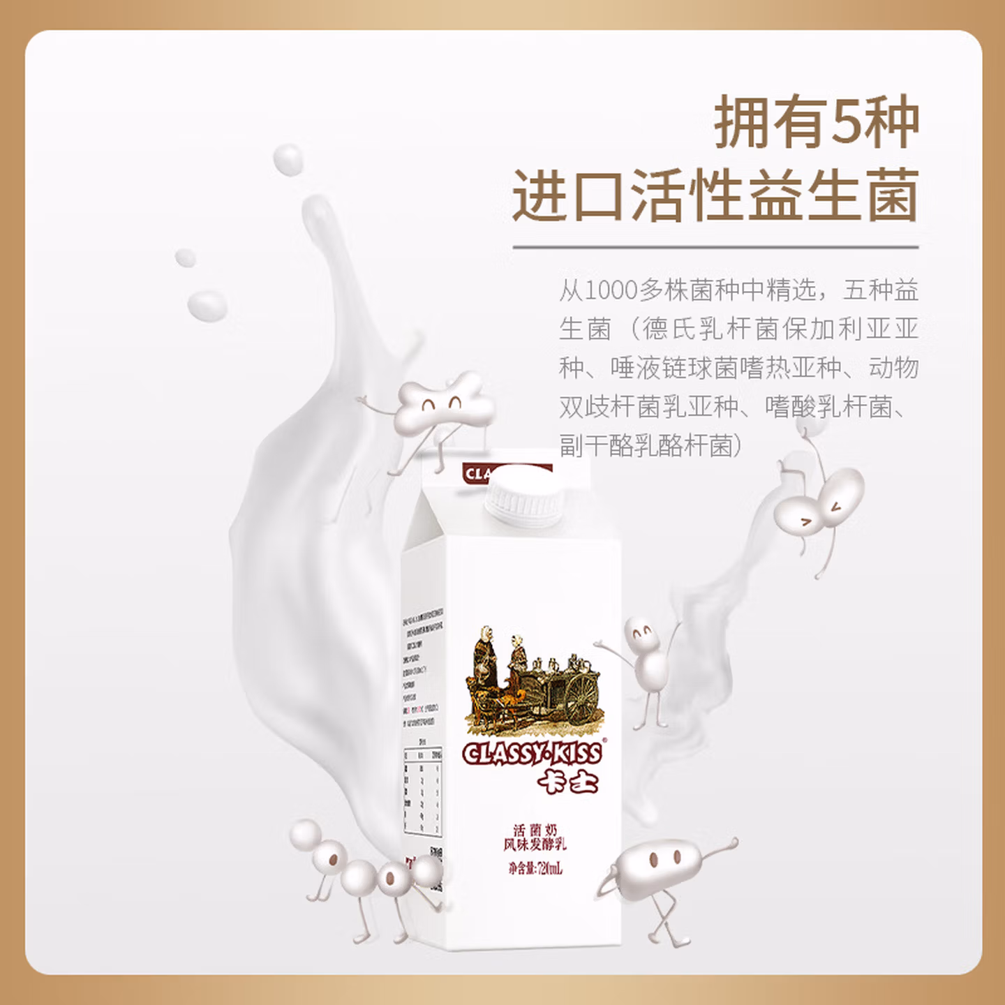这款CLASSY.KISS 卡士 活菌酸奶 风味发酵乳,生牛乳含量≥80%,欧洲配方经典滋味,拥有5种进口活性益生菌:德氏乳杆菌保加利亚亚种、唾液链球菌嗜热亚种、动物双歧杆菌乳亚种、嗜酸乳杆菌、副干酪乳酪杆菌。传承欧洲酸奶配方,结合现代二重均质工艺,成就独特爽滑浓醇口感。