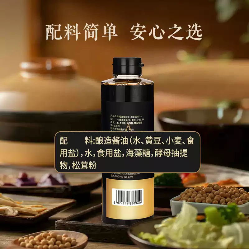 这款味满分 松茸鲜 0添加 味极鲜 调味汁 ,甄选云南香格里拉优质松茸,松茸富含的松茸醇、松茸多肽、氨基酸、蛋白质、膳食纤维都是不可多得的营养精华。将大自然孕育出的天然鲜味,用以代替谷氨酸钠、呈味核苷酸等增鲜剂,鲜美入味更健康。加入非转基因大豆、花果山泉水、优质小麦、未加碘食用盐酿制,不另外加蔗糖,自然提鲜,可放心食用。传承古法酿造工艺、全程手工酿造,180天晒露,用时间还原天然酱香。