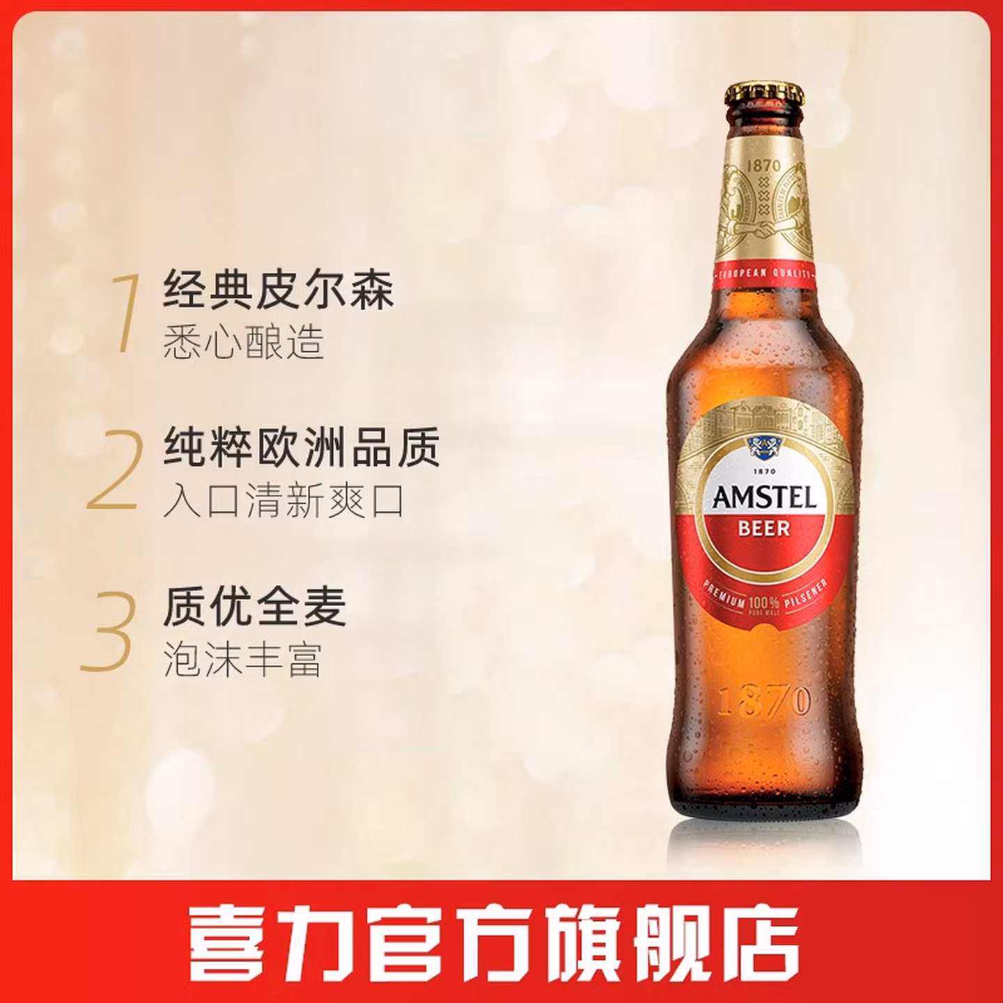 这款Heineken 喜力 Amstel 红爵 全麦啤酒, 清澈水源经过多重处理严格检验,精选体型饱满的优质大麦全麦酿造,啤酒花赋予红爵清爽的苦味与芬芳的酒花香,泡沫丰富 ,清新爽口易饮用。酒精度≥3.3%vol,原麦汁浓度≥8.5°P。