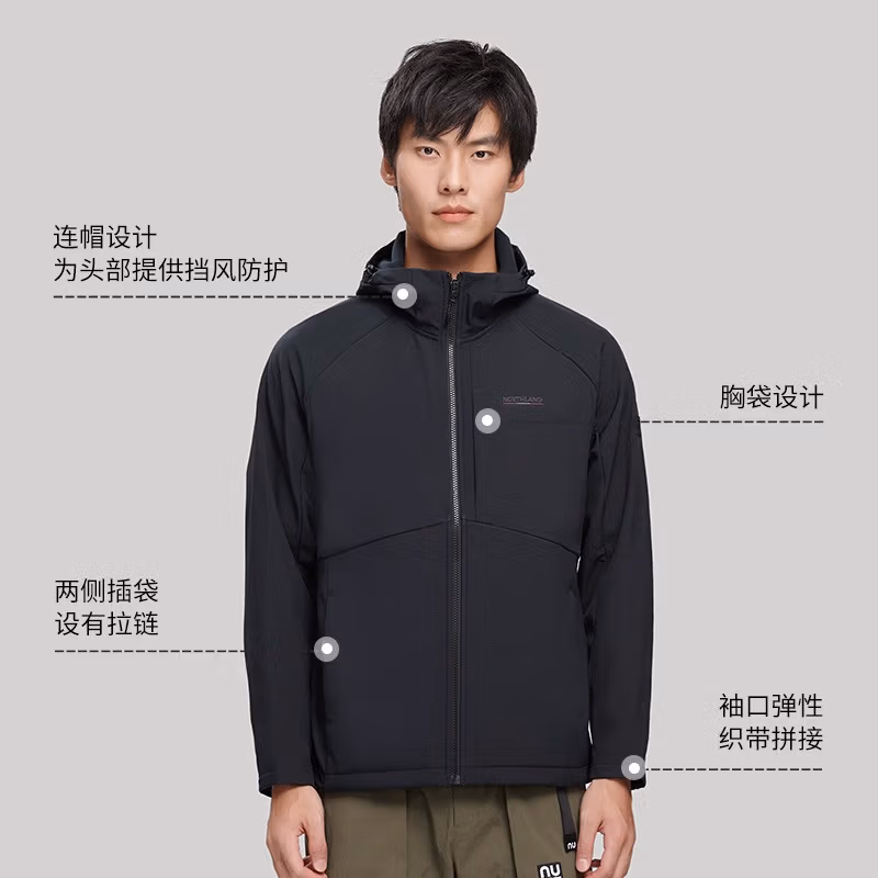 NORTHLAND 诺诗兰 22秋冬新款 男女防风防泼软壳连帽外套 NXJCH5507E,EXOTHERMR BEAD科技面料,防泼水,水滴在面料表面可以自行快速拨离,减少渗透浸湿。三层复合面料,内里拉毛,保暖不闷热,版型舒适,下摆可调节,松紧袖口,防止寒风灌入,后背反光印花,内里设有胸袋,方便舒适。