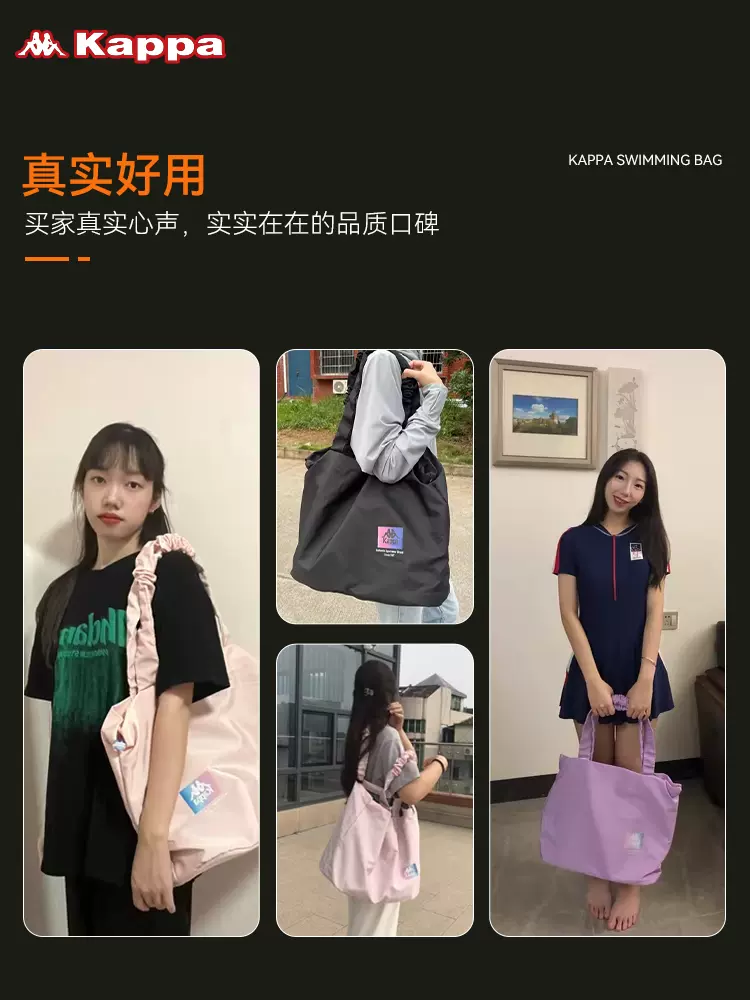 这款KAPPA 游泳健身运动包干湿分离防水收纳包 KP2160077,防防泼水材质,弹力堆花包带设计,时尚大方,舒适勒肩膀,手提或者肩挎都很OK;内置EVA防水袋,可放置毛巾、湿衣物或洗漱用品;分区设计方便又卫生;包口采用抽绳设计,实用性和时尚性都很好,休闲且清新的马卡龙配色,不挑时间不挑地点,在哪时背上都是人群焦点。尺寸27*11*17cm。