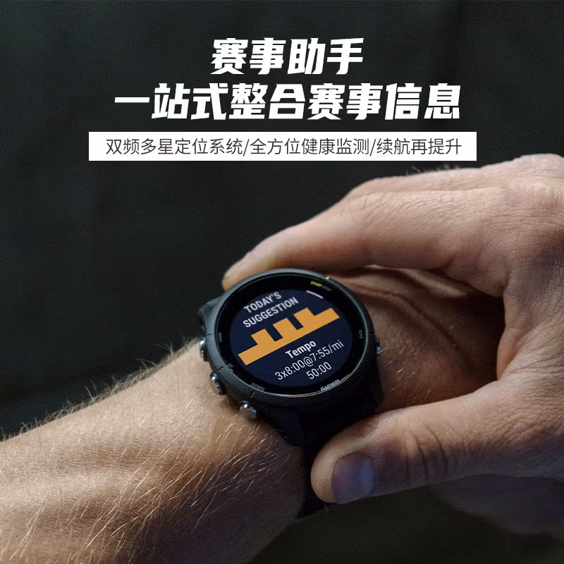 这款Garmin 佳明 Forerunner255 GPS智能运动手表,第三代康宁大猩猩玻璃,屏幕艳丽更耐磨。纤维增强聚合物表身,轻量又耐用。第4代心率传感器,数据更准确。全新搜星芯片,功耗更低,能同时搜索多重卫星系统+多种搜星频段,Al自动优选快速定位。HRV状态,洞察身体压力。内置铁三模式,运动中一键转换运动项目让你的铁三比赛数据完整记录不间断。支持室内外30多种运动模式,全程记录运动及生理数据,充分了解你的身体,满足不同运动需求。