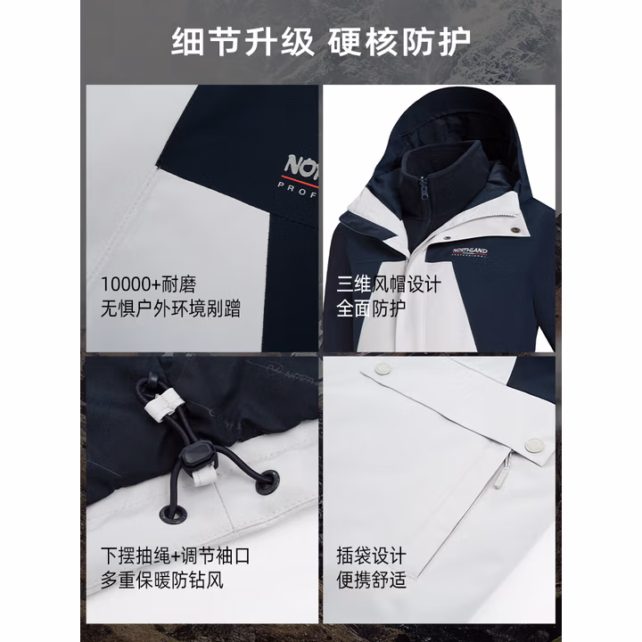 这款Northland 诺诗兰 胡杨林 三防全压胶户外冲锋衣 NWJET0505E,三合一设计,一衣三穿,应对不同气候。杜邦TEFLON®特氟龙三防面料具有抗沾湿性和去污性,有效阻挡油污、水、污渍入侵。EXOTHERM®CLASSIC防水透湿科技防水透湿科技,有效防止雨水渗透,并快速排除湿气保持体感干爽舒适。防水指数 ≈18405 mmH₂O,透湿指数 11500g/24h/㎡。高品质全压胶工艺增加防水性能,穿着干爽无渗漏。
