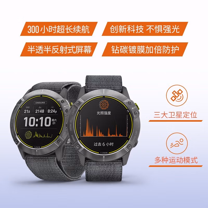 这款Garmin 佳明 Enduro安夺 户外登山太阳能多功能GPS手表 耀银版,1.4英寸Chroma半透半反射式屏幕,不惧强光,5g UltraFit超轻回环针织表带,采用Power Glass™太阳能充电镜面,利用阳光充电,可根据实际使用情况选择合适的电源模式,平衡性能与续航,在GPS ULtraTRAC模式续航可达300小时,而手表省电模式续航365天,智能模式续航65天,轻松完成长距离越野挑战。GPS、GLONASS、Galileo三大卫星定位系统,搜星速度更快,在户外树荫、高楼旁、短隧道等地方也能保持连接,且GPS轨迹会更加精准。表盘直径42mm,经典五键+触屏操作方式,内置徒步、登山、滑雪、游泳、骑行、高尔夫等数十种运动模式,满足不同场景,新增UltraRun超马模式,支持越野跑大摄氧量Vo2 Max、ClimbPro爬坡规划、休息计时器。ABC传感器,内置电子罗盘、高度计、气压计,PUlse Ox脉搏血氧,无论攀登还是睡眠,通过血氧即时了解身体适应情况。