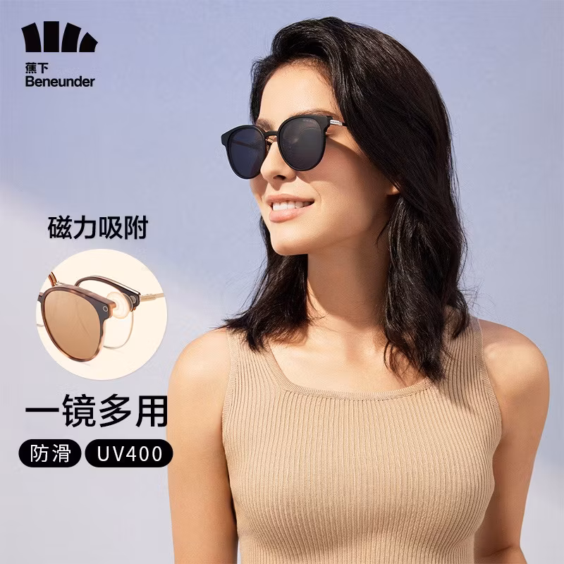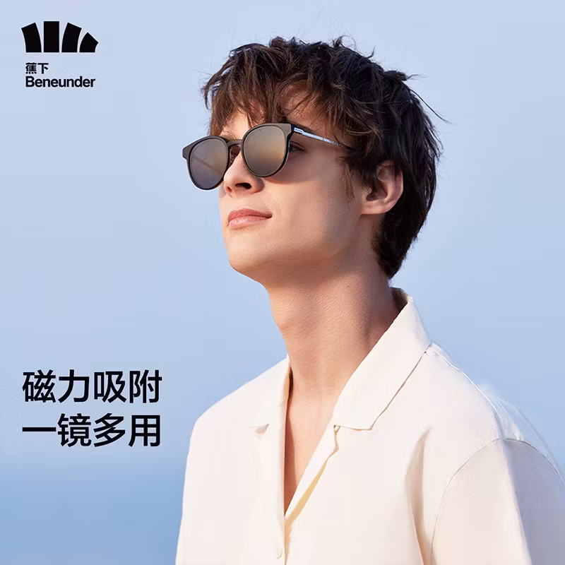 Beneunder 蕉下 伏望系列 中性款磁性吸附偏光太阳镜 10057123918488,内嵌四重磁铁,定向吸附无痕贴合,吸附力可达1.17N,磁吸墨镜贴片一触即合,高清平光镜秒变太阳镜,光学内框可配近视镜片。6层光学保护膜无缝贴合,PVA偏光功能膜,偏光效率≥99.4%,滤光UV400,100%阻隔紫外线的同时,视野更柔和清晰,防止刺眼眩光伤害。喷砂材质镜脚+气垫鼻托,中空结构搭配波纹设计,如气垫般软弹,防滑不易留痕。附赠170cm²墨镜包,可放纸巾手机等物品。