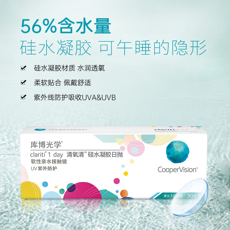这款CooperVision 库博清氧清日抛隐形眼镜 ,产地美国。高透氧高保湿硅水凝胶材质,透氧能力是普通镜片的4倍多,更多氧气直达眼角膜,双眸尽情呼吸。含水量56%,持久湿润,保证从早到晚水润舒适。模量指标0.5Mpa,镜片更柔软,佩戴更服帖,仿若无感。带紫外线防护功能,能有效过滤50%UVA以及95%UVB。