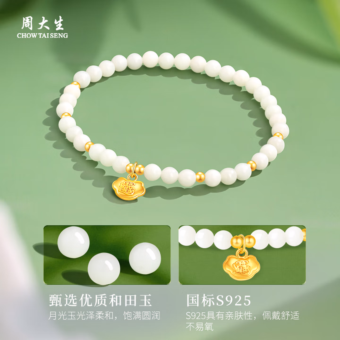 周大生 S925银 和田玉 长命福锁手串 JS1H0035,串珠甄选优质和田玉·月光玉制成,光泽柔和,饱满圆润,点缀转运小金珠,象征时来运转、好运连连。锁的设计简约但不简单,国标S925银材质,镀金处理,福字刻画其中,不仅福运满满,还寓意锁住寿缘,锁住福缘。双圈手串:周长约34±1cm(弹力绳),配送检测证书。